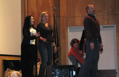 Rebecca performing improv with actors Denise Crosby & Dean Haglund