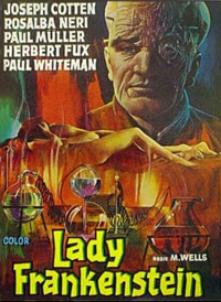 Dr. Frankenstein’s daughter “picks up the pieces” after daddy is killed by the monster he created. She, along with lab assistant Marshall, continue Dr. Frankenstein’s experiments. The two fall in love, but Lady Frankenstein doesn’t find Marshall physically attractive so she attempts to transplant his brain into the body of a handsome, mentally disabled servant. Meanwhile, Frankenstein’s Monster wreaks havoc across the countryside. This film features screen star Joseph Cotten (Citizen Kane) as Baron Frankenstein and Rosalba Neri as Tania Frankenstein.